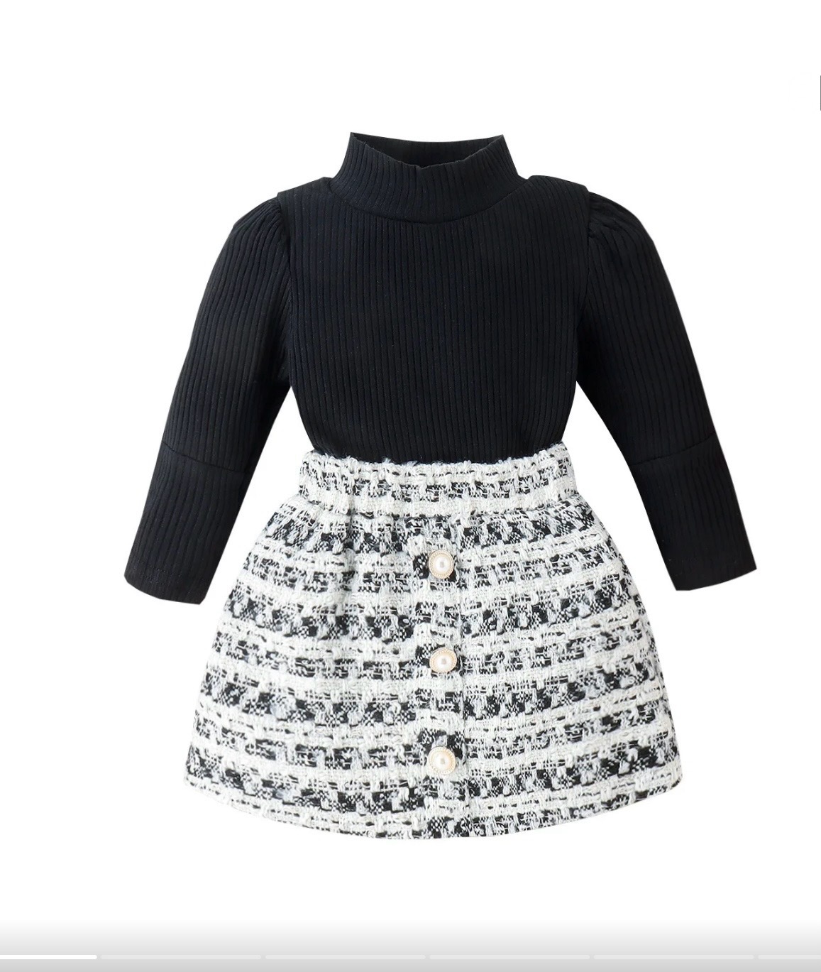 The centerpiece is the exquisitely crafted tweed skirt. Woven in a classic black and white pattern, it has a wonderfully substantial feel, while the pearl-style button details provide a touch of timeless Chanel-inspired elegance. The gentle elasticated waist ensures a perfect, comfortable fit.