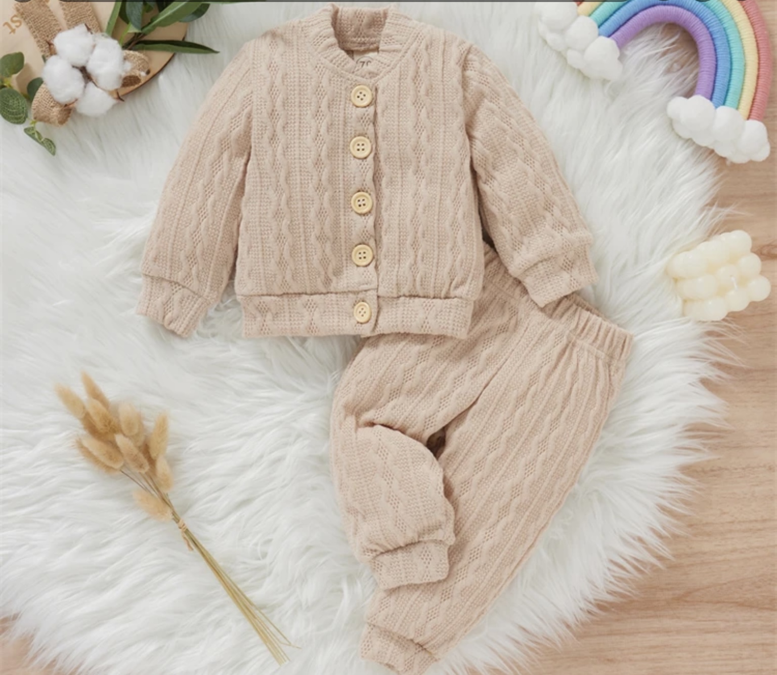 The perfect first outfit for your precious little one. Our Rozel Cosy Set is a beautifully soft, two-piece cable knit ensemble, featuring a button-up cardigan and matching trousers. The ideal ‘coming home’ outfit or a thoughtful newborn gift.