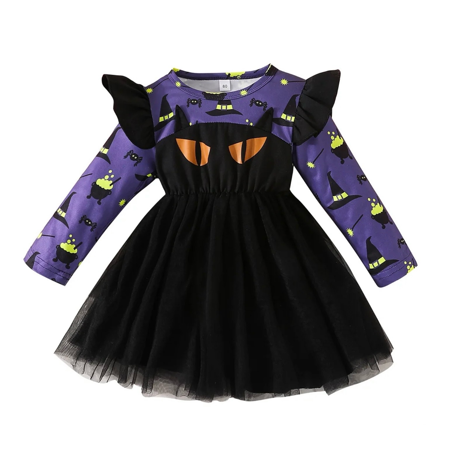 The design is brimming with magical details. The purple sleeves are covered in everything a little witch needs: pointy hats, bubbling cauldrons, and friendly spiders! The main dress features the face of a mystical black cat, her familiar, with enchanting orange eyes. And of course, the wonderfully full and swishy tulle skirt is perfect for magical twirling.